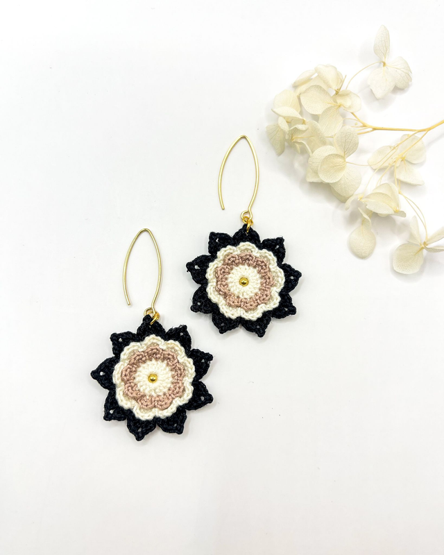 Grandes boucles d'oreilles fleuries noir, blanche et Taupe. Cette association de couleurs classique s'associera à merveille a un look habillé ou une jolie robe ♥