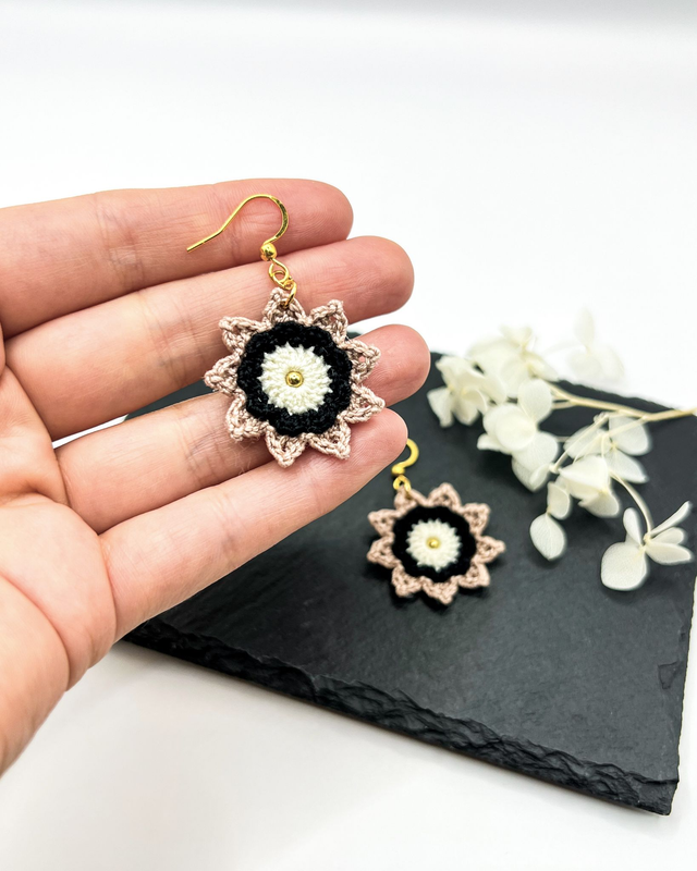 Une paire de boucles d'oreilles mariant le taupe, le noir et une touche de blanc. Crochetées à votre demande pour sublimer toutes vos tenues avec finesse et modernité. ♥