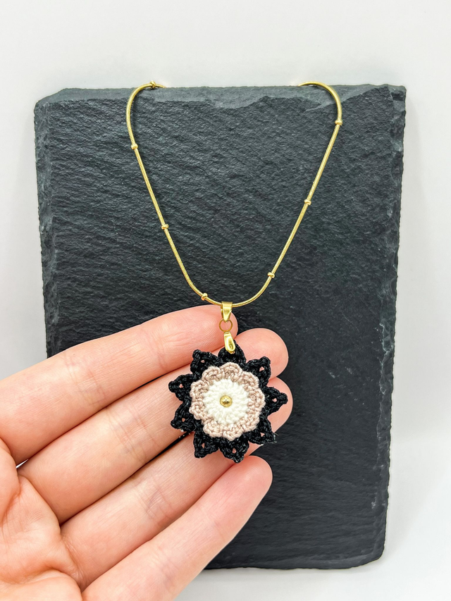 Pendentif en forme de fleur, crocheté à la main, accompagné d'une élégante chaîne serpentine perlée en acier inoxydable personnalisable en dorée ou argentée. Bijou bohème fin et délicat cadeau original pour femmes ♥